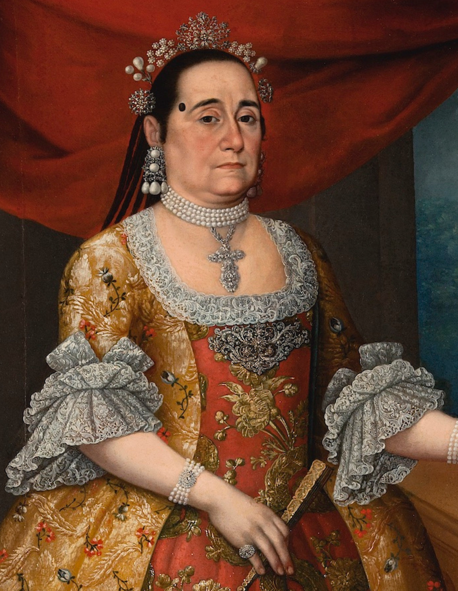 In Latin American territories under 18th-century Spanish rule, status seekers had been crazy for French fashion since the late 1600s, and owned the entire look: the sack-back gown (also called robe a la française or international style), the jewelry, the hair, and most importantly the famous beauty marks known as chiqueadores, lunas (moons, as in lunar marks) or peccas. Using circle, star, or crescent moon shapes, women adorned their faces with a single pecca or multiple ones (see Brooklyn Museum’s Doña María de la Luz Padilla y Gómez de Cervantes below).