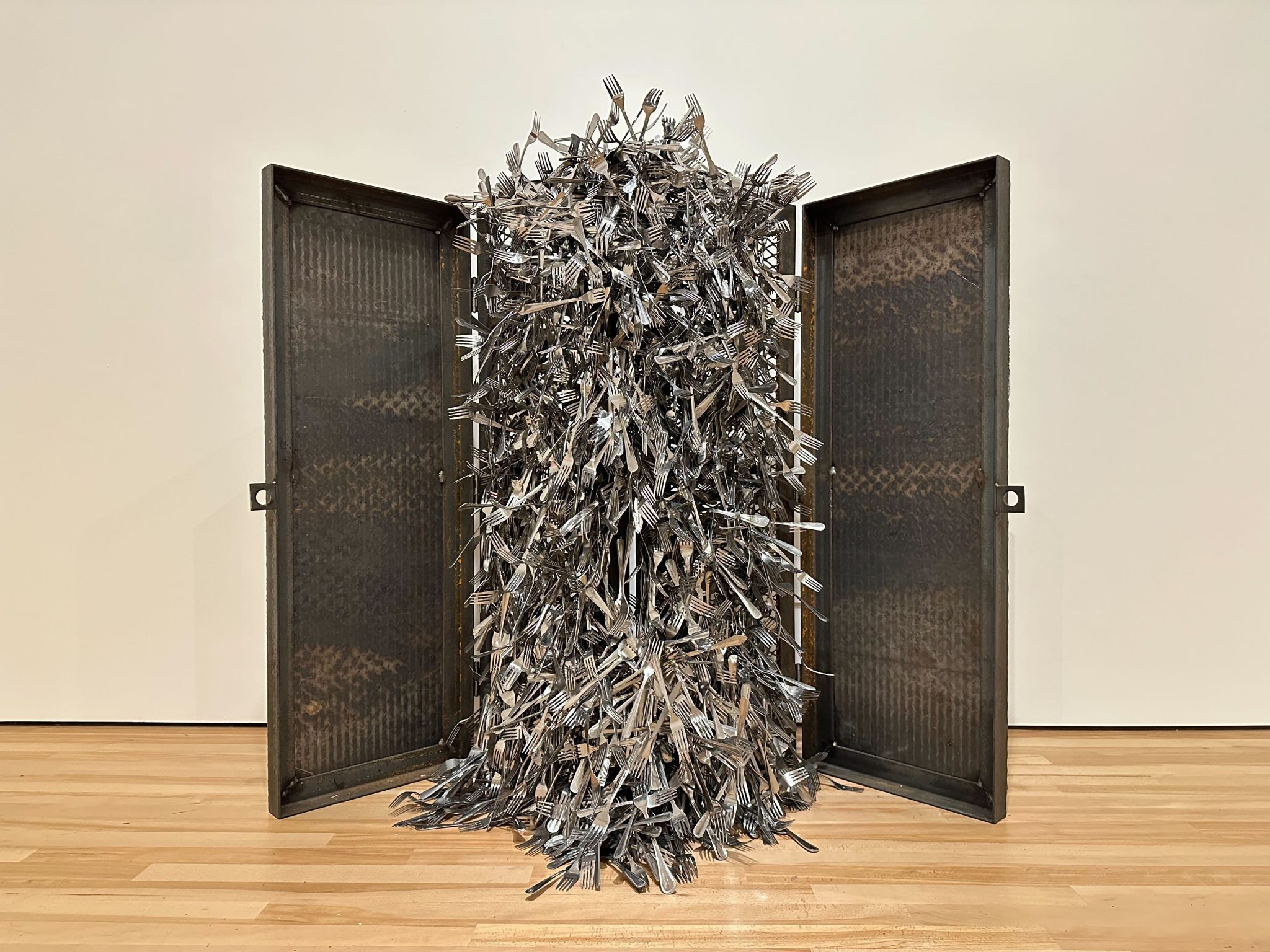 Bule’s Homage to Johnny (2019), a sculpture featured in Day Jobs, pays tribute to a coworker of the artist’s from her time working at a bakery in New York. A recent immigrant from Mexico, Johnny worked long hours as a dishwasher but was paid less than other employees—in part because he could speak neither English or Spanish, only the Indigenous language Nahuatl. Bule’s sculpture is crafted from nearly 1500 forks, attached by magnets to hulking grates that once covered the sidewalk entrance to a New York restaurant basement. Perhaps the triptych shape indicates that Homage could be an altarpiece to Johnny and his tireless dedication. Alternatively, the mass of tenuously connected forks may indicate the precarity of Johnny’s situation and that of immigrant laborers as a whole.