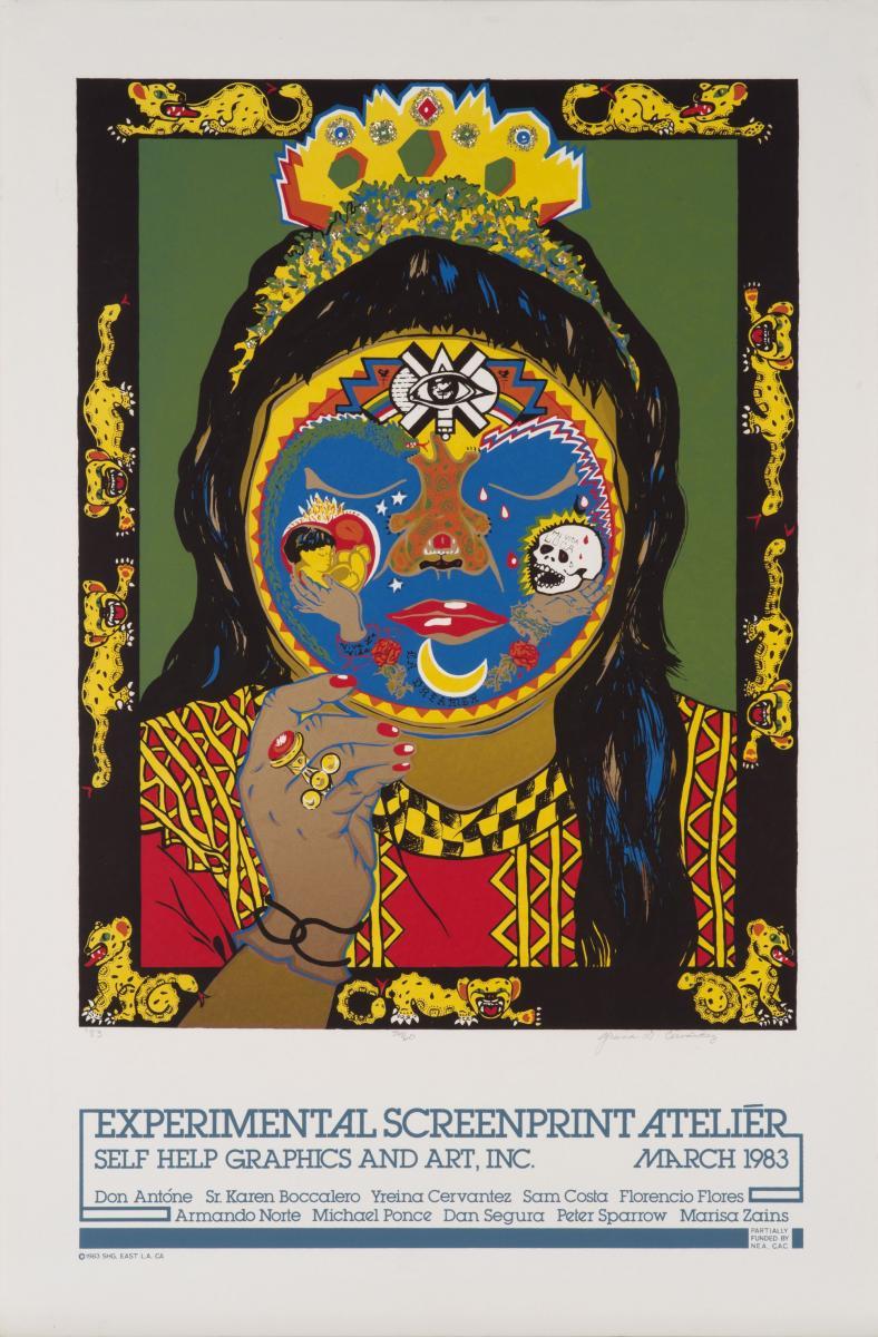 In late 1982, Self Help Graphics inaugurated their Experimental Atelier Program, still ongoing. They invite local and visiting artists to produce limited edition screen prints. Sometimes the ateliers focus on a specific theme or group of artists. Since its inception, the program has produced over a thousand prints by hundreds of artists.