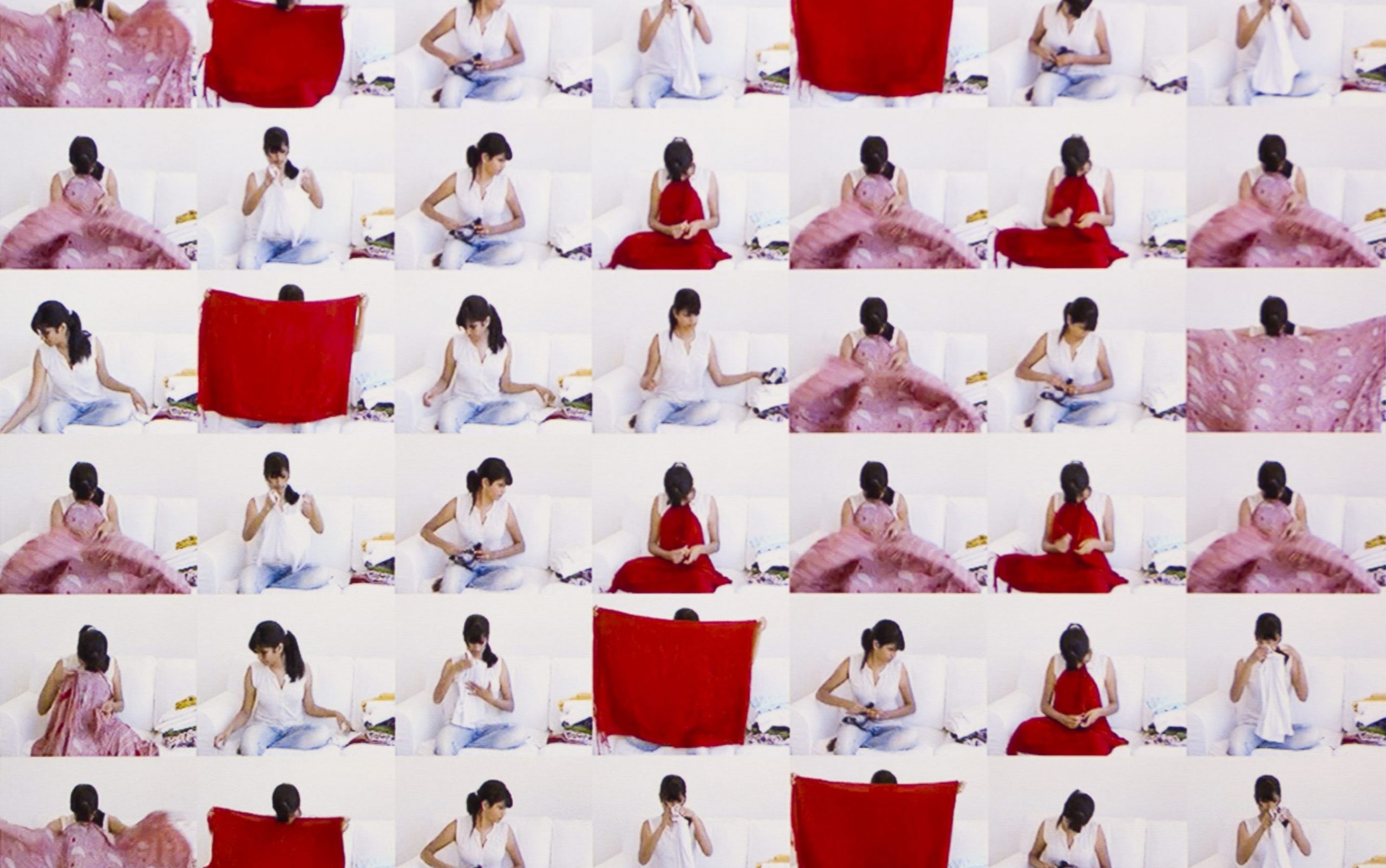 In the projected video, FOLD (2010), a grid of twelve-by-eight frames captures the Indian-born, San Francisco-based artist Surabhi Saraf in jeans and a white shirt as she folds laundry on the couch. Through color, sound, repetition, fragmentation, and multiplication, Saraf turns a prosaic activity into a captivating visual and sonic experience. With a background in experimental sound and classical Indian music, Saraf creates audio and video installations that slow down our perception of time.